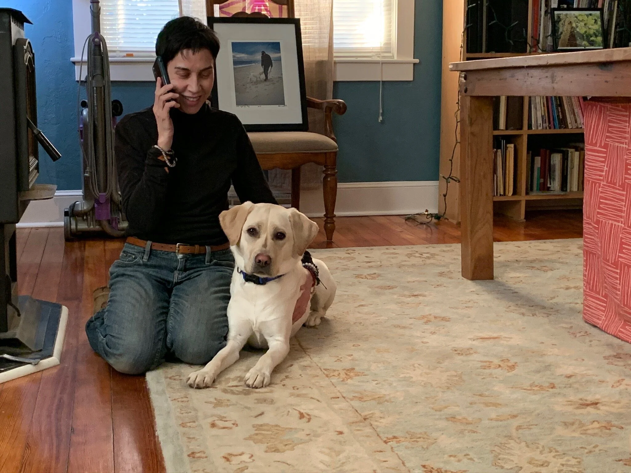 This was the other evening. I was on the phone and she just wanted to be close. Needless to say, my husband and I are very smitten and grovel at her paws. (Notice the vacuum cleaner. A MUST with a Lab).