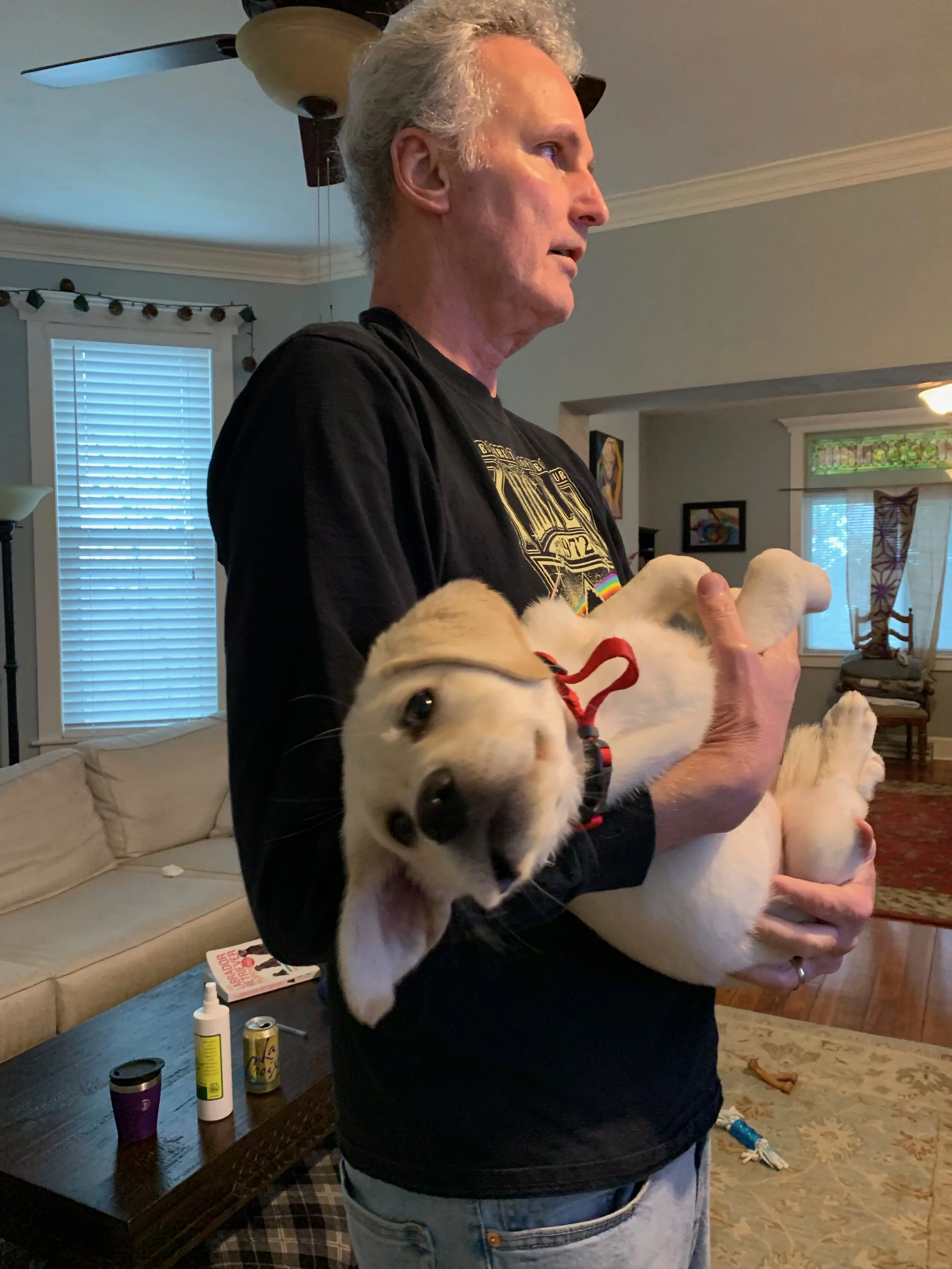 This is my husband, Dihlon, cradling her. She was smaller then but he can still pick her up and throw her in the tub when she is full of mud as he did last night.